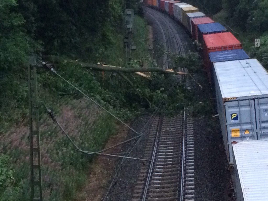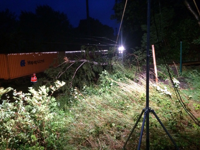 Da die Bäume auf die Oberleitung gestürzt sind, musste die Bahnstrecke zwischen Nienburg und Neustadt gesperrt werden. Die Einsatzstelle wurde ausgeleuchtet und die Bäume mit Hilfe von Seilwinde und Kettensägen aus dem Gleisbereich entfernt. Nach vier Stunden konnten wir wieder einrücken.