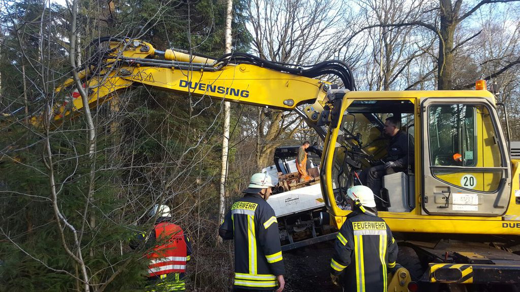 Mit Hilfe der Seilwinde unseres Rüstwagens und des Baggers eines ortsansässigen Bauunternehmens konnte der LKW ohne Sachschaden aus der misslichen Lage befreit werden. Ein besonderer Dank gilt dem Bauunternehmen Duensing aus Eilvese für die spontane Hilfe.