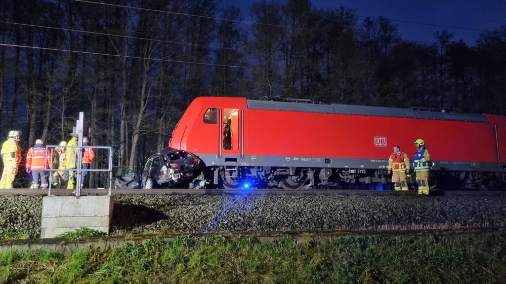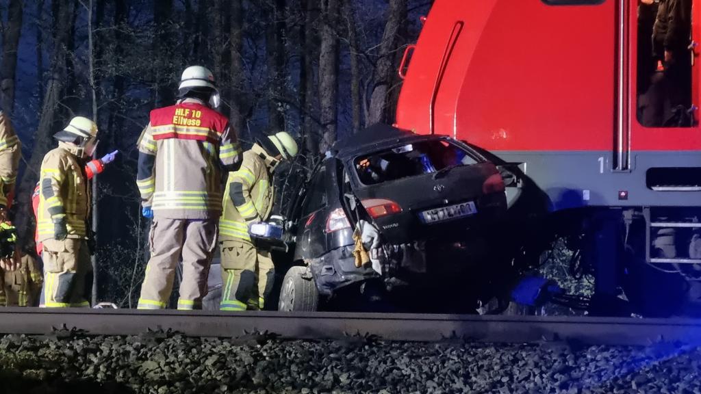 einer in Fahrtrichtung Bremen befindlichen Regionalbahn am Bahnübergang erfasst und ca. 400m mitgeschleift. Der Rettungsdienst konnte für die drei Insassen leider keine Hilfe mehr leisten, sie